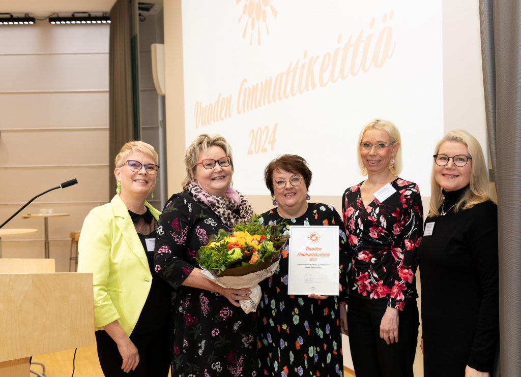 Kuvassa voittajien edustajat Siilinjärveltä kukkien ja kunniakirja kera. Rinnalla onnittelijat Ammattikeittiöosaajat ry:stä. Henkilöt vasemmalta oikealle Virpi Kemi Amko ry, Marja Andronoff ja Sirpa Kurki, Siilinjärven ruoka-ja puhtauspalvelut, Marjut Huhtala, Amko ry ja Kirsi Hanski, Amko ry. Kuva: Juha Tuomi.
